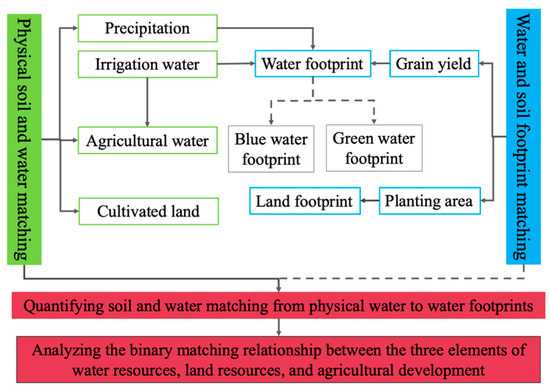 However, there is still limited understanding of how the interplay between water and soil resources affects food production, particularly from a spatial perspective that integrates physical water and water footprint. This understanding is essential to the effective planning of water–soil resources to ensure sustainable food production and food security. The water footprint, bridging physical and virtual water, is commonly used to quantify the relationship between food production and water consumption, offering insights into agricultural water use and its utilization efficiency [12]. It has been widely employed to estimate water consumption for various crops at both global and regional scales [13]. In this study, we therefore examine regional grain–water–soil resource matching from a “physical water–water footprint” perspective, aiming to thoroughly understand the matching characteristics and relationships among them.