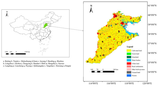 Geographical location of and land use types in the NCP under the current scenario (2020).