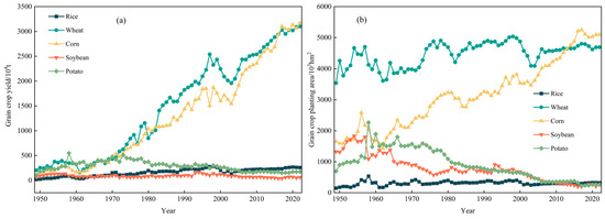 Overview of rain planting in the NCP from 1949 to 2022: grain crop yield (a); grain crop planting area (b).