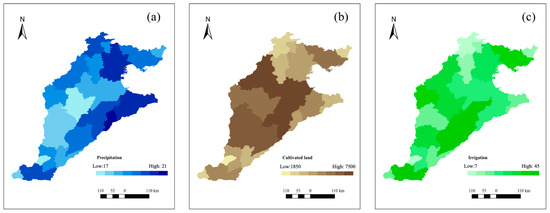 The spatial matching of natural water–soil shows a trend of spatial mismatch, primarily evident in the distribution of precipitation, cultivated land, and irrigation water (Figure 4). Precipitation shows a spatial pattern of “higher values in the east and north and lower values in the central and southern regions”. Specifically, it is mostly concentrated in areas such as Tianjin, Jinan, Binzhou, and Dongying in Shandong Province and Xinxiang in Henan Province. In contrast, the main agricultural production areas, including Hengshui, Xingtai, Handan, and Cangzhou, experience lower precipitation (Figure 4a). The spatial distributions of cultivated land and irrigation water in the NCP generally exhibit a state of spatial overlap (Figure 4b,c), displaying a distribution pattern distinguished by “higher values in the central areas and lower values in the northern parts”. They are particularly concentrated in the central region of the NCP, specifically in cities such as Hengshui, Xingtai, Handan, and Cangzhou.