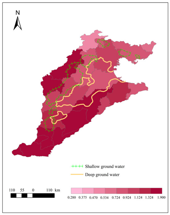 The shallow groundwater depth in the NCP ranges from 10 to 70 m, and the elevation of the groundwater level ranges from −30 to 45 m. The deep groundwater head depth ranges from 50 to 120 m, and the elevation of the head is about −90 to 40 m [31]. The high-value area of water–soil matching coefficients in the NCP coincides with the boundary of the groundwater funnel area (Figure 8). The latter is primarily distributed across the central and eastern regions, such as Hengshui and Cangzhou, as well as the alluvial fan margin of “Baoding–Shijiazhuang–Xingtai” in front of the Taihang Mountains. This forms a composite shallow and deep groundwater funnel area represented by Baoding, Shijiazhuang, Xingtai, and Handan. The groundwater funnel area tends to expand, influencing both the agricultural water–soil matching coefficient and the boundary of the groundwater funnel. The matching coefficients of overlapping areas, such as Shijiazhuang, Xingtai, Handan, and Langfang, were all greater than 0.534. Most of the high-value areas of water–soil matching was distributed in the range of the groundwater funnel, demonstrating a spatial connection between the two (Figure 8).