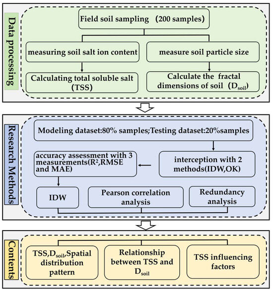 The key issue in addressing soil salinization lies in the improvement of soil structure [24]. Essentially, measures to ameliorate saline soils involve regulating soil water and salt movement, promoting the downward leaching of salts, and preventing the upward migration of salts due to evaporation [25,26]. Therefore, understanding the relationship between soil salinity and particle size is crucial. Soil particle size significantly influences the retention and transfer of water, nutrients, air, and heat in the soil [27], and it influences soil permeability, soil water and salt transport, nutrient conversion, and solute migration [28,29], thus affecting soil quality. Numerous factors influence soil salinity accumulation [30]. Soil texture is one of the spatial drivers of soil salinity, characterized by the relative proportions of fine and coarse mineral particles. The size and shape of soil particles affects pore morphology, and the interactions between gravity, cohesion, and capillary forces can affect the movement of water and salts [31]. In assessing soil texture, researchers have found the soil fractal dimension (Dsoil) to be a useful tool for characterizing particle size distribution (PSD) and soil structure [32,33]. This dimension serves as a quantitative indicator for evaluating soil fertility and degradation [34], reflecting the distribution of coarse and fine particles and their correlation with soil fertility, hydrodynamic properties, and erosion resistance, which are essential for ecological restoration.