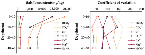 As can be seen in Figure 4, in conjunction with the depth of soil sampling, the overall salt ion content was highest in the surface layer, second highest in the second layer, and lowest in the fourth layer. The anions were Cl− > SO42− > HCO3− > CO32− and the cations were Na+ + K+ > Ca2+ > Mg2+ in the soil surface. This showed that the major anions in the study region were Cl− and SO42− and the major cations were dominated by Na+ + K+. The coefficients of variation in Cl−, CO32−, and Mg2+ among all the ions were more than 100%, which were highly variable ions, while the other ions were of medium variation.