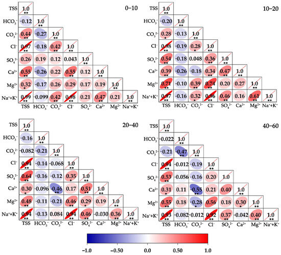 Correlation analysis between soil salt ions can help to reveal the synergistic migration of salt ions in soil [61]; therefore, this study was conducted using a Pearson correlation analysis between TSS and salt ions using SPSS 25.0. From the surface to the deeper layers, the correlation between soil salinity and salt ions showed significant differences. As shown in Figure 5, TSS showed non-significant correlation with both HCO3− in 0–60 cm soil layer; non-significant correlation with CO32− in 20–40,40–60, and significant correlation in this soil layer; and significant correlation with SO42− in all but 0–10 cm soil layer. In addition to this, TSS showed significant correlation with all other ions, with the largest correlation coefficients with Cl−, Na+ + K+, all of which had correlation coefficients above 0.9. It indicates that soil salinity is mainly associated with Cl−, SO42−, CO32−, Ca2+, Mg2+, Na+ + K+. From the results of the correlation of salt ions with each other, Cl− and Na+ + K+ showed highly significant correlation with correlation coefficients above 0.9 in all soil layers. In addition, in 0–10 cm CO32− vs. Na+ + K+; Cl− vs. Ca2+; in 10–20 cm CO32− vs. Mg2+; Cl− vs. Mg2+; in 20–40 cm CO32− vs. Ca2+; SO42– with Ca2+; SO42− with Na+ + K+; and CO32− with Ca2+; Cl− with Mg2+; SO42− with Na+ + K+ in 40–60 cm showed highly significant correlation. Overall, the correlations between TSS and Cl− and Na+ + K+, as well as between Cl− and Na+ + K+, were high, suggesting that Na+ + K+ and Cl− have the strongest synergistic migration ability.