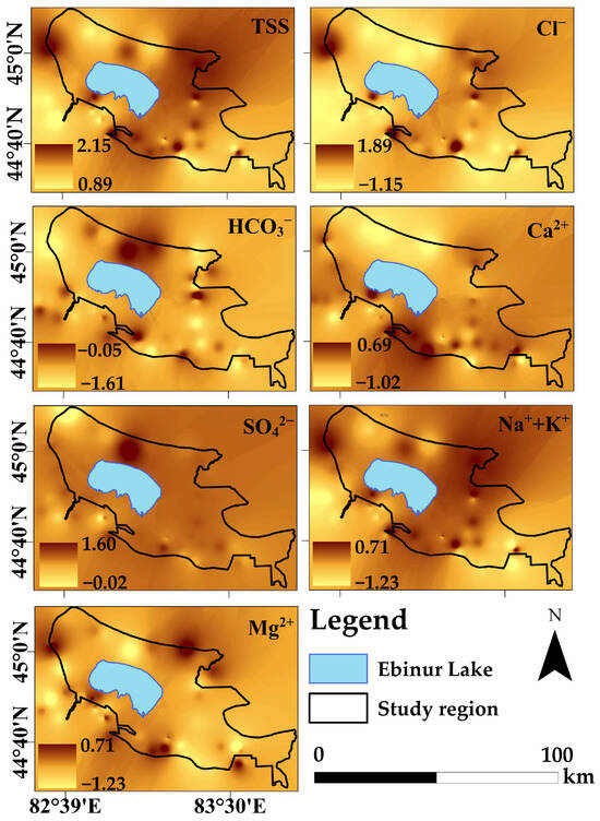 In this paper, the spatial distribution maps of TSS and each ion from 0 to 10 cm were obtained by spatial interpolation using IDW. As shown in Figure 6, the spatial distribution characteristics of TSS and salt ions are more similar, and the overall distribution is more dispersed. The high value areas of TSS were mainly distributed in the periphery of Lake Ebey, such as the northwest and southwest sides of the lake, as well as the southeast side of the lake. The spatial distributions of TSS were roughly the same as those of Cl−, SO42−, and Na+ + K+; and the trend of spatial distribution was opposite to that of HCO3−. And from the comparison between ions, it can be seen that the spatial distribution of Cl− and Na+ + K+ is extremely similar; contrary to the trend of the spatial distribution of HCO3−, the spatial distribution of SO42− is more similar to that of Ca2+ and Mg2+.