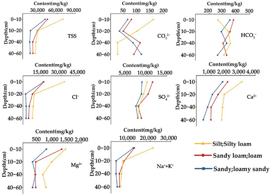 Figure 9 shows the differences in the contents of TSS and salt ions in different soil textures. CO32− was excluded from the analytical section below due to the lack of CO32− in most of the samples, resulting in low CO32− levels and large errors. Overall, TSS and salt ions were highest in the 0–10 cm, with most ions showing a decrease in content with increasing soil depth. TSS, Cl−, SO42−, Ca2+, Mg2+, Na+ + K+ content increased with finer soil texture in different soil textures, except for HCO3− ions. In 0–20 cm, TSS, Cl−, Mg2+, and Na+ + K+ were more variable, with reductions ranging from 53 to 75%, and in 20–60 cm, the variations leveled off, with variations ranging from 0.5 to 14.5%. From 0 to 60 cm, the reduction of HCO3−, SO42−, and Ca2+ varied between 0.1 and 36%, with small variations. HCO3− and SO42− content varied little in different soil textures, with an overall “S” pattern. In summary, the average TSS content of the soil gradually increased as the soil texture became finer and Dsoil increased. It also showed that there were significant differences in the migration of different salt ions across the soil profile.