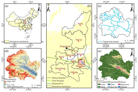 Location of the study area and land-use features: (a) administrative divisions of China; (b) administrative divisions of Shaanxi Province; (c) main natural rivers in Shangzhou District; (d) elevation map and distribution of maize planting points; (e) land-use status map of the study area in 2023.