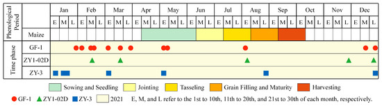 Based on the administrative boundaries of Shangzhou District and the phenological period of maize, remote sensing images from 2020 to 2024 were selected. However, each year exhibited varying degrees of data gaps or incomplete coverage of the study area. Although the 2021 data also had missing months, they were still the best available data compared to other years. Therefore, this study utilized three high-resolution satellite images covering the area in 2021, including images from Gaofen-1 (GF-1), Ziyuan-1 02D (ZY1-02D), and Ziyuan-3 (ZY-3). A total of 42 scenes were obtained in 2021. Among them, six scenes were obtained during the maize sowing and seedling stage from mid-April to early June, three were obtained scenes during the tasseling stage from mid-July to early August, and two scenes were obtained during the grain filling and maturity stage from mid-August to early September. No images were acquired for the jointing and harvesting stages, mainly due to heavy cloud cover during these periods, which prevented effective acquisition. Data acquisition for other time periods is as follows: 10 scenes in January, 6 in February, 8 in March, 2 in November, and 5 in December. All data were downloaded from the China Resource Satellite Data and Application Center (http://www.cresda.com.cn (accessed on 9 October 2023)). However, the high-resolution data provided by this platform are not open to international researchers. If international researchers need to access remote sensing data, they can browse through the Natural Resources Satellite Remote Sensing Cloud Service Platform (https://www.sasclouds.com/ (accessed on 21 September 2023)) and obtain data from the SPACE WILL platform (http://en.spacewillinfo.com/ (accessed on 13 January 2025)). Other relevant information is provided in Table 1, and the acquisition times of the different images are shown in Figure 2.
