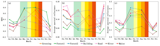 By combining sample data obtained from field surveys and visual interpretation, the average NDVI values corresponding to maize sample points in the NDVI images for each month were calculated, resulting in the NDVI time series curve for maize over seven months. Using the same approach, NDVI time series curves for other typical land cover types can also be derived. Additionally, the arithmetic mean spectral reflectance of the red band (B3) and the near-infrared band (B4) for typical land cover types was compared with the NDVI curve, as shown in Figure 3. It is worth noting that the NDVI values of rivers in Figure 3a are negative, which is a normal phenomenon. This is because the spectral reflectance characteristics of water bodies typically result in a higher reflectance in the red band than in the near-infrared band, leading to a negative NDVI value. This phenomenon is expected and reflects the unique spectral reflectance behavior of water bodies.