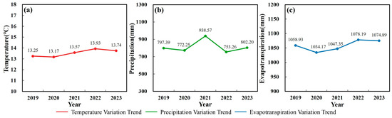 Annual variation trends of temperature, precipitation, and evapotranspiration in the study area from 2019 to 2023: (a) annual variation trend of temperature; (b) annual variation trend of precipitation; (c) annual variation trend of evapotranspiration.