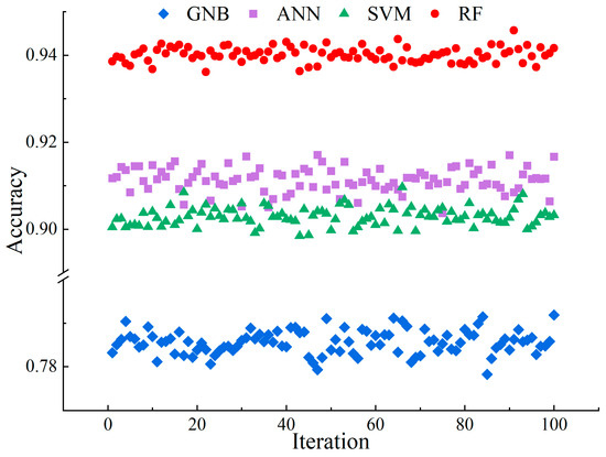 Figure 5 illustrates the distribution of classification accuracy across 100 iterations for the four algorithms. Both Random Forest and Support Vector Machine exhibit high stability, with minimal fluctuations across iterations, though Random Forest shows smaller fluctuations than Support Vector Machine, indicating a more robust model and lower error. In contrast, Artificial Neural Network and Gaussian Naive Bayes displayed larger fluctuations across iterations, indicating lower stability. Overall, the Random Forest classification algorithm demonstrates the highest reliability for classification tasks.