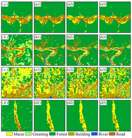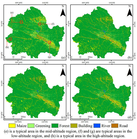 Four typical areas were selected for result presentation and analysis based on different elevation levels. Area a is located in the mid-elevation region, areas b and c are in the low-elevation region, and area d is situated in the high-elevation region. As shown in Figure 8, cultivated land in areas a, b, and d is mainly situated near residential areas on mid-slopes and distributed along roads, with relatively small maize plots surrounded by extensive forested regions. In contrast, area c is located in a flatter region near an industrial building, where farmland is more concentrated, though fragmentation is still present. Overall, the maize planting area in region c is larger than in regions a, b, and d.