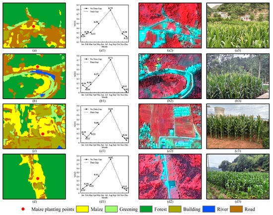 Distribution of main crop maize in typical areas: (a–d) are the classification results of typical regions; (a1,b1,c1,d1) are the NDVI curves for maize in these regions; (a2,b2,c2,d2) are the images of these regions; (a3,b3,c3,d3) are field photographs of these regions.