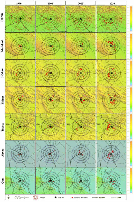 The study examines all of Iran’s metropolitan regions, consisting of seven areas with populations over one million, as recorded in the 2016 census by the Statistics Centre of Iran [44]. These regions include urban cores and adjacent built-up areas within defined proximity, officially classified as metropolitan areas. Threshold distances vary based on geography, urban planning, and infrastructure. For Tehran–Karaj metropolitan region, the threshold extends up to 50 kilometers due to significant sprawl, while other regions have thresholds up to 40 km, influenced by size, density, and development patterns [45]. These thresholds demarcate urban cores from surrounding rural or natural areas. Measuring urban density, such as the ratio of developed to natural land, could further refine these boundaries. Each metropolitan area has unique spatial dynamics affecting thresholds. Accessibility to parent cities via established road networks ensures the inclusion of urban and peri-urban areas contributing to sprawl [46,47]. Smaller rural settlements with populations over 50 households are also included, providing a comprehensive analysis of urban development patterns.