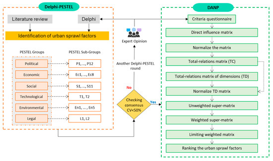 This study uses a hybrid approach to identify and analyze the drivers of urban sprawl in Iran as a developing country. In this approach, after reviewing the research literature in order to extract the drivers of urban sprawl, a combination of PESTEL analysis, the Delphi technique, and the DANP (DEMATEL-based Analytic Network Process) multi-criteria decision-making method has been used to categorize, identify, and determine the cause-and-effect relationships between the drivers of urban sprawl and, finally, to rank them. The process of this study is illustrated in Figure 2. Each method was selected based on its unique potential and characteristics to provide more profound and practical insights, which will be explained below.