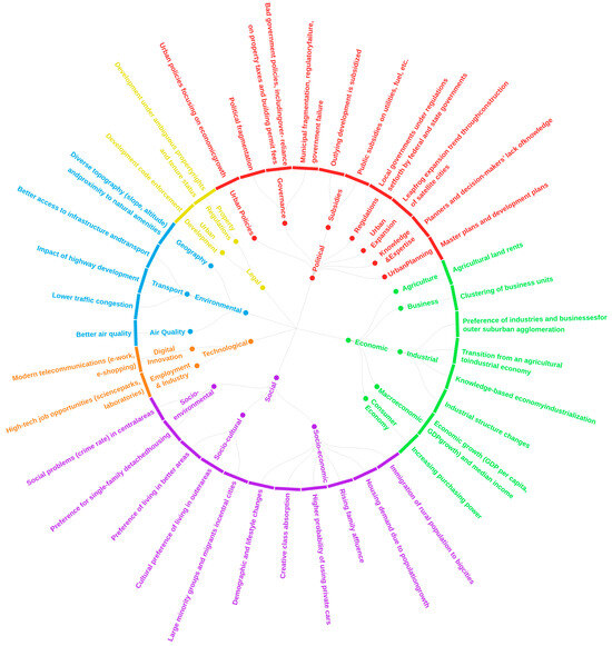 The study aimed to identify the causes of urban sprawl in Iranian metropolises through a literature review and expert analysis using qualitative and quantitative techniques. It identified 40 sub-factors in six categories contributing to urban sprawl and discusses the results of each primary factor based on their ranks. In contrast to the diverse factors that contribute to urban sprawl in high-income countries, Iran’s sprawl is predominantly shaped by socio-economic conditions and travel patterns [11]. As illustrated in Figure 6, economic, political, and social factors are Iran’s most significant drivers of urban sprawl.