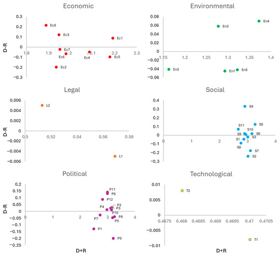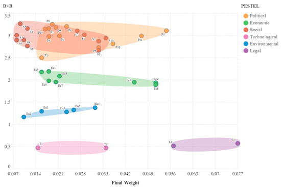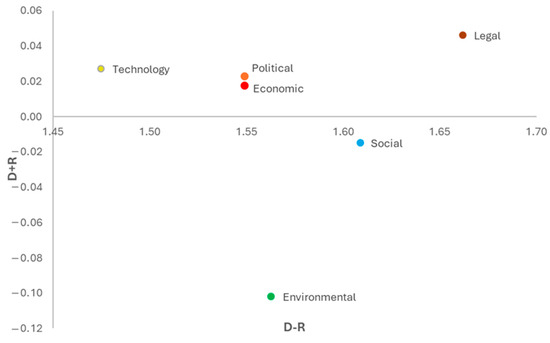 Considering the comprehensive analysis conducted through the D-R analysis method for each sub-model of the PESTLE framework, the findings presented in Table 1 shed light on the relative strengths and weaknesses of various factors within the Political, Social, Environmental, Legal, and Technological sub-models.