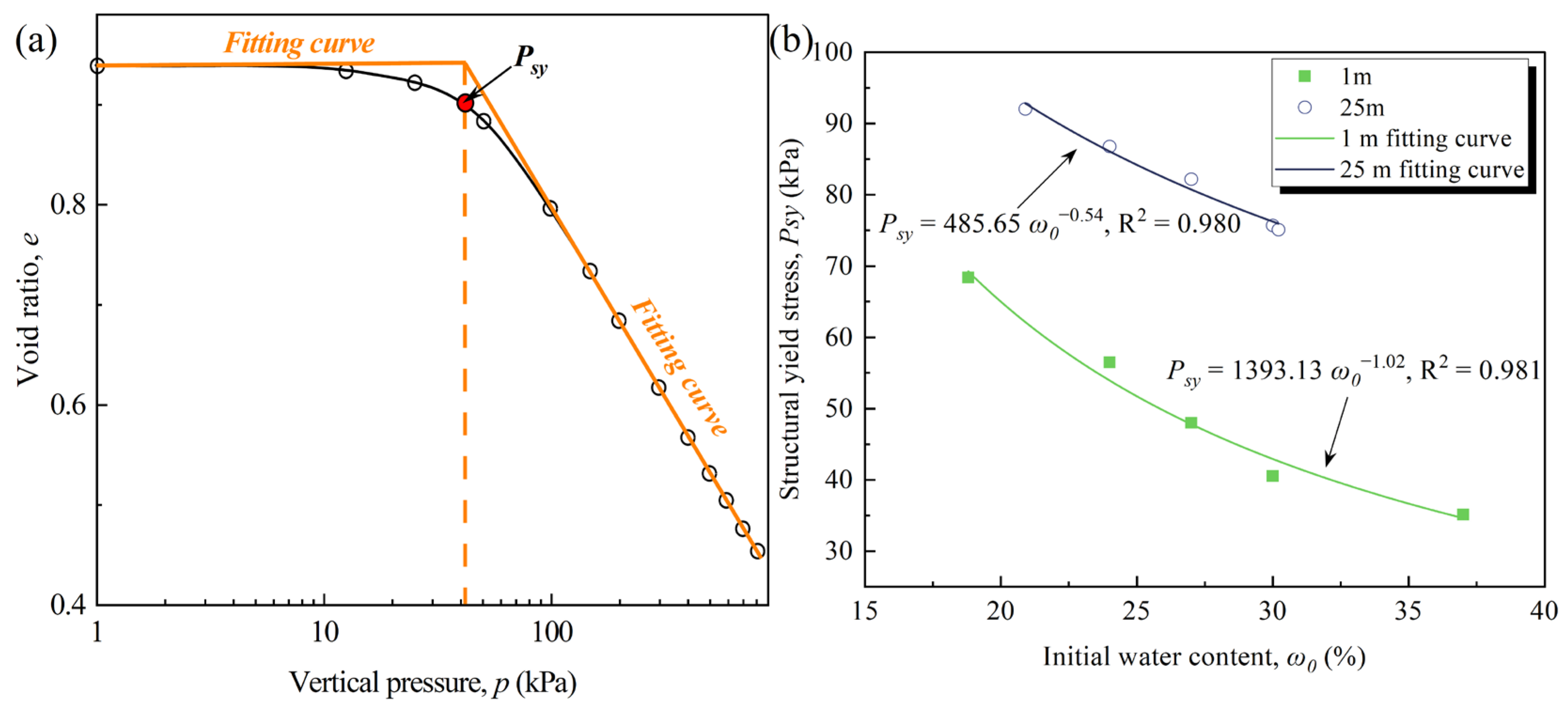 - The 1 m sample demonstrated greater compressibility compared to the 25 m sample, with contrasting trends in their compressive deformation under wetting conditions. While the 1 m sample’s compressibility increased progressively with wetting, the 25 m sample’s compressibility decreased. The increasing initial water content reduced the structural yield stresses of both samples, with a more pronounced decline in the 1 m sample;