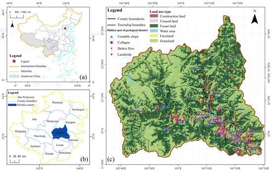 Geographical location, land use, and geological disaster. (a) Location of Southwest China, (b) location of Heishui County, (c) land use type and geological disaster map of county.