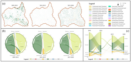 (a) Distribution map, (b) Sankey map, and (c) chord map of landscape type transfer and change.