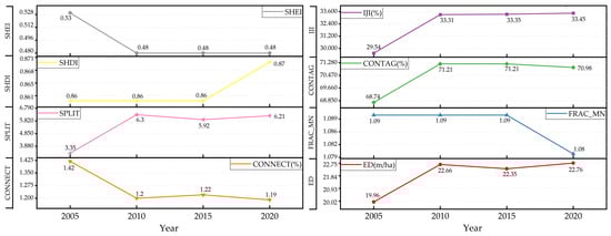 From 2005 to 2020, the landscape-level indices are presented in Figure 3. In terms of shape, the FRAC_MN is relatively low and slightly decreasing, indicating that the overall landscape patch shape is relatively simple and gradually becoming stable. Meanwhile, the ED value is gradually increasing by 2.8. Regarding aggregation, the CONTAG value slightly increases by 2.24%, and the SPLIT increases by 46.05%, indicating an increase in the fragmentation of patches of the same type and a more clustered distribution of heterogeneous landscape patches. The IJI and CONNET reflect the connectivity level of landscape patches; an increase in the IJI from 29.54% to 33.45% and a decrease in the CONNET from 1.42% to 1.19%. The SHDI and SHEI together reflect the even distribution of landscape types, with their values being directly proportional to the degree of uniformity. The SHDI value remains essentially unchanged at 0.86 and is relatively high, while the SHEI value slightly decreases from 0.53 to 0.48.