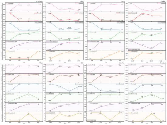 Landscape type level indices from 2005 to 2020 are presented in Figure 4. The PLAND and LPI reflect the dominance of patches, with the largest values for forest land of 49.75% and 34.64%, respectively, indicating that forests are the dominant landscape type, followed by grasslands. NP and PD together represent the degree of landscape fragmentation, and both values in farmland have been steadily increasing, reaching their peak values of 1 and 2, respectively, in 2020. Grassland and forest land have higher LSI values compared to other landscape types, above 40, suggesting that their overall patch shapes are more complex than other land types. Notably, the LSI and PAFRAC for water bodies surged between 2005 and 2010, increasing from 5.69 to 28.76 and from 1.25 to 1.77, respectively. This suggests that external forces contributed to a rapid rise in both the number and the shape complexity of rivers and lakes during this period. The highest ED value for forest land, from 18.88 to 20.35, indicates strong edge heterogeneity. The highest AI values for grasslands and forest lands suggest a highly aggregated landscape distribution, which is attributed to the large-scale construction of alpine pastures. In contrast, construction land has the lowest value of 87.26 in 2005, but it increases to 88.77 in 2020.