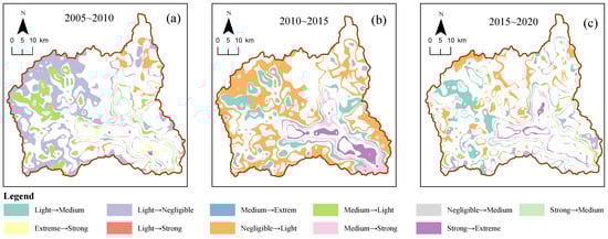 Transfer matrix of ecological vulnerability levels at county scale from (a) 2005 to 2010, (b) 2010 to 2015, and (c) 2015 to 2020.