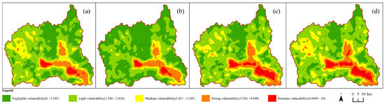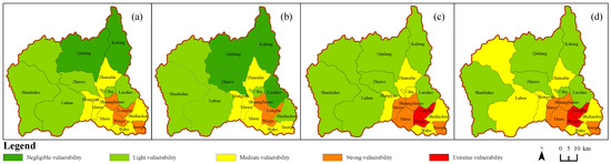 Spatial distribution map of ecological vulnerability at township scale in (a) 2005, (b) 2010, (c) 2015, and (d) 2020.
