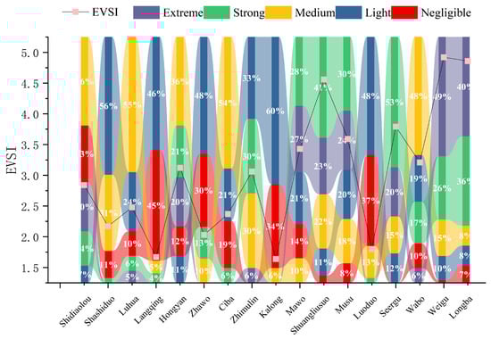 The area proportion of different vulnerable grades and the EVSI of each township in 2020.