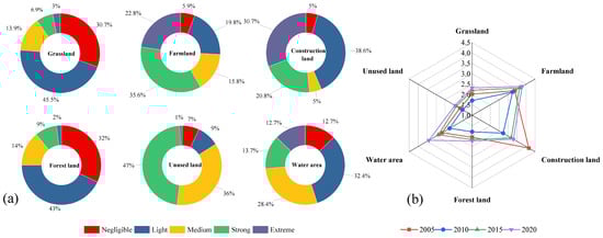 The EVSI of all land use types shows an upward trend. The ranking of ecological vulnerability indices for different land types are as follows (Figure 9b): in 2005, construction land farmland water area forest land grassland ; in 2010, farmland construction land water area forest land grassland unused land ; in 2015, farmland construction land water area grassland forest land unused land ; in 2020, farmland water area construction land grassland forest land unused land . It can be seen from the average area proportion of various classes (Figure 9a) that grasslands are lightly vulnerable; forest land ecological vulnerability is mainly light and negligible, with some areas close to population centers showing strong and extreme vulnerability; construction land shows a more extreme distribution, with the largest proportion of slightly and extremely vulnerable areas, where construction land is mainly slightly vulnerable, and construction land in the southeast shows extreme vulnerability; farmland has the largest proportion of strong vulnerability, followed by extreme vulnerability; water areas are mainly light and moderately vulnerable; unused land, though small in area, is often poor in soil, has very low vegetation coverage, and has steep terrain slopes, leading to soil erosion, and thus, unused land has the largest proportion of medium- and strong-vulnerability areas. Overall, the ecological vulnerability of all land use types shows an upward trend.