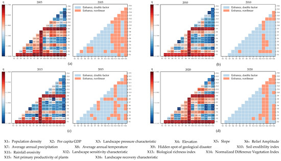 The results of the factor detection are shown in Table 5. In 2005, the five indicators with the strongest explanatory power for the ecological vulnerability index were mean annual precipitation (0.435), mean annual temperature (0.457), elevation (0.457), geological disasters (0.666), and population density (0.683); in 2010, the five factors with the strongest explanatory power were per capita GDP (0.478), elevation (0.5), mean annual temperature (0.501), population density (0.743), and geological disasters (0.784), indicating an increased influence of human intervention during this period; in 2015, the five factors with the highest explanatory power were soil erodibility (0.298), per capita GDP (0.396), elevation (0.544), population density (0.79), and geological disasters (0.806), with the explanatory power of geological disasters, population density, and soil erodibility further strengthening, while the explanatory power of per capita GDP declined; in 2020, the five factors with the highest explanatory power were rainfall erosivity (0.496), elevation (0.524), temperature (0.544), geological disasters (0.755), and population density (0.793).