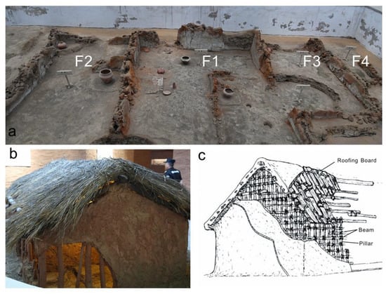 Houses F1–F4 and restoration model of the wood skeleton and mud walls at Dahecun Museum. (a) Houses F1–F4, photoed by Junjie Xu; (b) restoration model of wood skeleton and mud walls, photoed by Junjie Xu; (c) structure of wood skeleton and mud walls house, modified after He [36].
