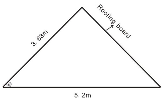 The squares of the excavated houses in the Dahecun site of Yangshao culture were basically between 3 and 122 m2 and mainly ranged from 10 to 30 m2 (Table 2). The excavation findings reveal that the majority of the houses were rather severely damaged, with F1-F4 (Figure 4) being the best preserved, among which F1 was representative. F1 was a rectangular ground-based wood skeleton and mud wall building, the length from north to south is 5.2 m, and the width from east to west is 4 m, covering an area of 20.8 m2. Apart from the two locations that were damaged by ash pits, the foundation and some parts of the walls were well preserved. The walls on the east, west, and north sides were the best preserved among them; they were 0.5 to 1 m higher than the floor of the house, and the thickness of the walls was about 0.3 to 0.5 m. Inside F1, there was a suite with an inbuilt fire pit [22]. A restoration model of wood skeleton and mud walls is exhibited at Dahecun Museum as origination of F1 (Figure 4b). Both in terms of area and construction technique, F1 was highly representative. In this study, we use F1 as the benchmark, collect all of the wood skeleton and mud wall houses, and estimate the wood consumption in Late Yangshao culture of Zhengzhou region. In this study, we count pillars, beams, and roofing boards to calculate the wood consumption of the entire house in F1. For example, we use the four walls of F1 as squares to measure minimum wood consumption. Referring to the results of Yang and He [36,38], we hypothesize that the structure of the F1 roof is as shown in Figure 5: the angle between the roof and the wall is 45°, and there are no purlins. The total wood consumption of F1 (Vt) is a sum of pillar (Vpi), beam (Vb), and roofing board (Vrb) (Figure 4c).