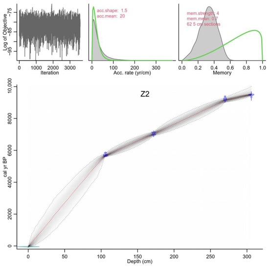 An age-depth model (Figure 6) for the studied Dahecun Z2 core was constructed using the Bayesian age-depth modeling software rcarbon 1.5.1 in R [43,44] based on four AMS 14C dates (Table 1).