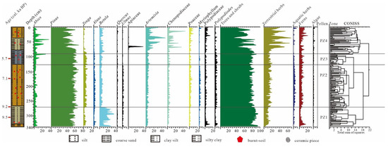 In total, one hundred and sixty-seven samples were extracted at 2 cm intervals for palynological investigation. Spores and pollen grains were allocated to four categories: trees and shrubs, herbs, ferns, and algae. Calculation of relative abundance and pollen diagram plotting were carried out using TILIA 1.7.16 and TILIA.GRAPH [42]. Division of the core into pollen zones was based on the results of a Constrained Incremental Sums of Squares (CONISS) cluster analysis conducted in TILIA.
