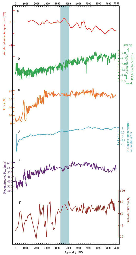 Comparison of Dahecun Z2 core pollen record with various other regional and global environmental signals. (a) Simulated mean temperatures based on mollusks from East Asia [48]. (b) δ18O record from Dongge Cave [49]. (c) Tree pollen percentages from Gonghai Lake [51]. (d) Synthesized Northern Hemisphere (30–90° N) temperature record during the Holocene [50]. (e) Pollen-based annual precipitation (PANN) reconstructed from Gonghai Lake [51]. (f) Trees and shrubs pollen percentages from Dahecun Z2 core (this study). The shaded lines indicate changes around the Late Yangshao period.