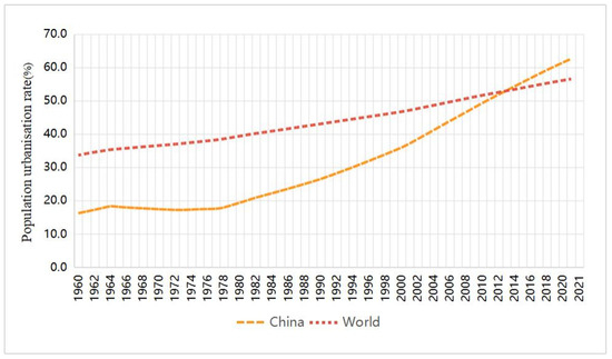 The world has witnessed the fastest period of urbanization in history in the past several decades. The global urbanization has increased from 33.6% in 1960 to 56.5% in 2021 [1] (Figure 1). Along with the quick development of global industrialization and urbanization, cities have dealt with human technological progress, economic development, and social civilization, which are also a focus of environmental pollution, ecological destruction, and social problems [2,3]. A recent estimate finds that more than 70% of global energy-related carbon emissions occurred in cities [4,5]. As the country with the fastest urbanization process in the world, the urbanization of China also faces great challenges [6]. According to statistics from the World Bank, urbanization in China grew from 16.2% in 1960 to 62.5% in 2021 [1]. In China, the scale of urban construction land increased from 30,781.28 km2 in 2004 to 59,424.59 km2 in 2021 (National Bureau of Statistics of China) [7]. Clearly, the utilization of land resources is accompanied by the entire process of urbanization. However, the urban environmental problems are also becoming increasingly serious with the rapid advancement of urbanization and industrialization [8,9]. The amount of urban sewage discharge in China grew from 14.94 billion m3 in 1978 to 6.39 trillion m3 in 2021 [10]. Therefore, how to break out of the path dependence of existing urban construction land utilization and achieve green utilization is a critical task.