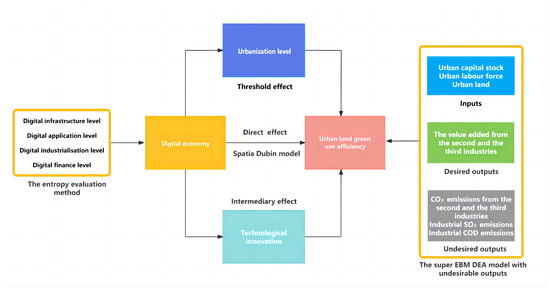 The digital economy, combining with different economic activities, is a new economic form that uses data to allocate resources to promote the development of productivity, profoundly changing the structure of economic growth [28]. The digital economy of China has an enormous extent currently, which exceeded 50.2 trillion RMB in 2022, accounting for about 41.5% of its GDP. As a vigorous economic growth pattern, the digital economy has been endowed with expectations of improving energy and resource use efficiency and reducing pollution emissions. Hence, numerous researchers have devoted their time to conducting further relevant research. Some researchers argue that the digital economy can promote energy efficiency [29,30], carbon emission efficiency [31,32], ecological efficiency [32,33], green economic efficiency [34], and so on, through productivity improvements or technological innovations, while other scholars, finding conflicting evidence, agree that the digital economy may also lead to more energy consumption and pollutant emissions in the process of stimulating economic growth. Furthermore, the available literature lacks studies on ULGUE, and many questions remain unanswered as follows: How does the digital economy impact ULGUE? What are the impact mechanisms for the digital economy on ULGUE? Is there a nonlinear relationship between them? With the rapid expansion of urban construction in China, it is crucial to research the effects of the digital economy in solving the problems of urban land shortages and environmental degradation.