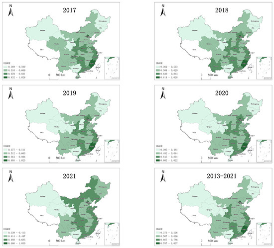 The temporal and spatial changes in ULGUE from 2013 to 2021.