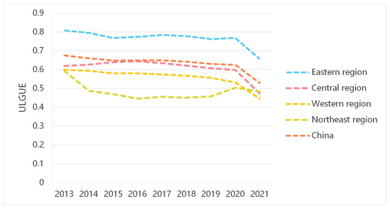 Table 4 shows the calculation results of ULGUE. Figure 4 demonstrates the spatial distribution maps of the ULGUE by the Natural Breaks Classification Method. The ULGUE in China has been measured between 2013 and 2021, and the average value is 0.675. Only 12 provinces top the national average of ULGUE. As a whole, the ULGUE in China needs improvement. The average ULGUE of 30 provinces in the country during the study period shows an initial decline and then an increase between 2013 and 2017. However, ULGUE has a downward tendency from 0.650 in 2017 to 0.530 in 2021 (Figure 5), with a particularly notable drop in 2021, for which the COVID-19 pandemic is a major contributing factor. From a regional perspective, the eastern region has the highest level of ULGUE, followed by the central and western regions, and the northeastern region has the lowest. There is an overall trend of decreasing change from the coast to the interior.