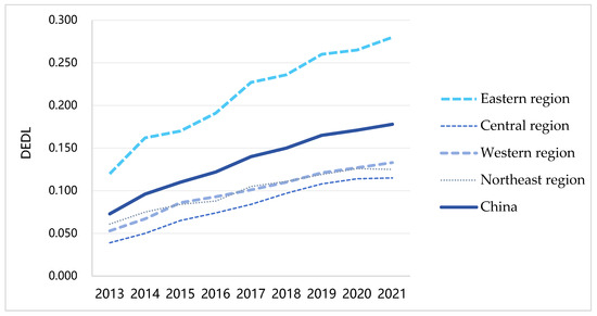 Table 5 shows the evaluation results of DEDL by applying the entropy evaluation method. Compared with 2013, the DEDL demonstrates an increasing trend during the study years for all provinces in 2021, which is the result of the continuous improvements in digital infrastructure, market size of the digital economy industry, digital technology level, and digital application level.