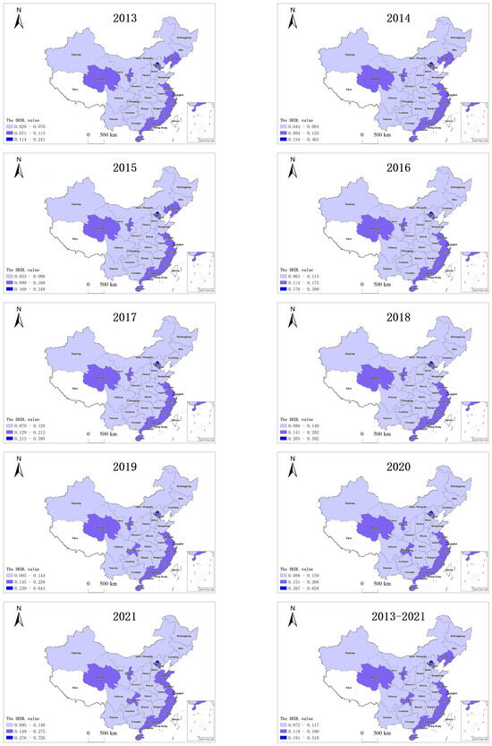 Spatial distribution maps of the DEDL of China from 2013 to 2021 were made using the Natural Breaks Classification Method (Figure 7). In 2013, only Beijing and Shanghai had high levels of DEDL, and their mean values of DEDL during the studied period were 0.241 and 0.227, respectively. Guangdong, Zhejiang, Hainan, Tianjin, Jiangsu, Qinghai, Fujian, Ningxia, and Liaoning were in the middle level of DEDL, and their values of DEDL were between 0.071 and 0.113 in 2013. The remaining 20 provinces had low values of DEDL in 2013. In 2021, both Shandong and Chongqing entered the region with high DEDL, while Liaoning dropped into the region with low DEDL. It is worth noting that the DEDL of Liaoning in 2021 did not decrease compared with that in 2013. As shown in Table 5, the DEDL of Liaoning increased from 0.087 in 2013 to 0.147 in 2021, but its DEDL is growing more slowly than the national level, indicating that more effective measures are needed to promote DEDL in Liaoning.