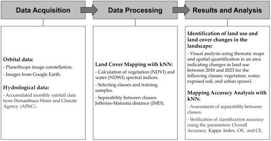 In the first step, data acquisition was carried out with the selection of scenes, considering factors such as broad coverage, absence of clouds, periods of low rainfall incidence, and availability of data sharing via cloud platforms. Additionally, as the vegetation of the Caatinga biome, present in the study area, is sensitive to rainfall [45], it is necessary to analyze the response of spectral indices concerning vegetation, considering the effects of precipitation. In this regard, precipitation data for the study region during the image acquisition period was obtained from the Pernambuco Water and Climate Agency (APAC).