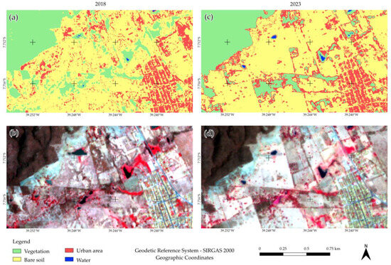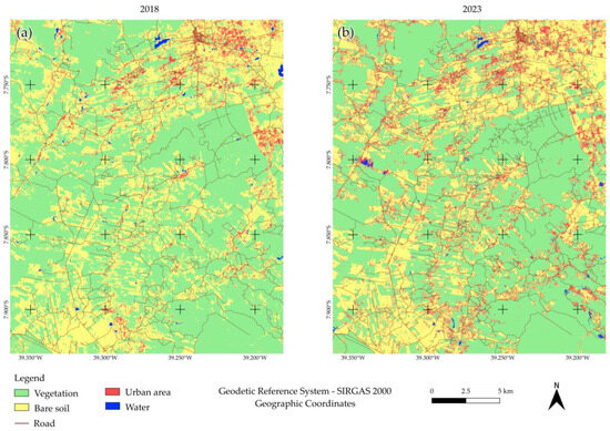 Thematic land use and occupation maps for 2018 and 2023: (a) classified image for 2018 and (b) classified image for 2023, generated using the kNN algorithm. The maps highlight four classes: water, urban area, bare soil, and vegetation. The comparison reveals a noticeable increase in built-up areas and a proportional reduction in vegetated areas, particularly near natural water resources, indicating accelerated loss of riparian forests. Bare soil areas remained largely unchanged over the five-year period.