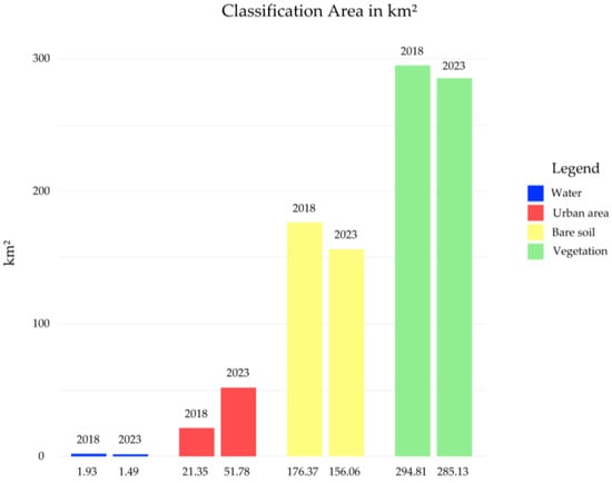 After the image classification process, each pixel was assigned a value to one of the four predefined classes, where the value 1 corresponds to water, 2 to urban area, 3 to bare soil, and 4 to vegetation. The quantitative analysis was conducted by summing the pixels of each class for the analyzed years. The PlanetScope satellite images have a spatial resolution of 3 × 3 m, which implies an area of 9 m2 per pixel. To facilitate quantitative analysis, the total area of each class was converted from m2 to km2, allowing for a more accessible comparison of classified areas between the years 2018 and 2023.