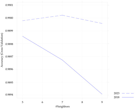 Cross-validation, as described by Kohavi [63], is a technique used to assess a statistical model’s generalization ability and to tune hyperparameters, such as k in kNN. The most common cross-validation method is k-fold, which divides the dataset into k subsets. The model is trained k times, each time using k-1 subsets for training and the remaining subset for testing. The model’s performance is then evaluated by averaging the results obtained in each of the k iterations.