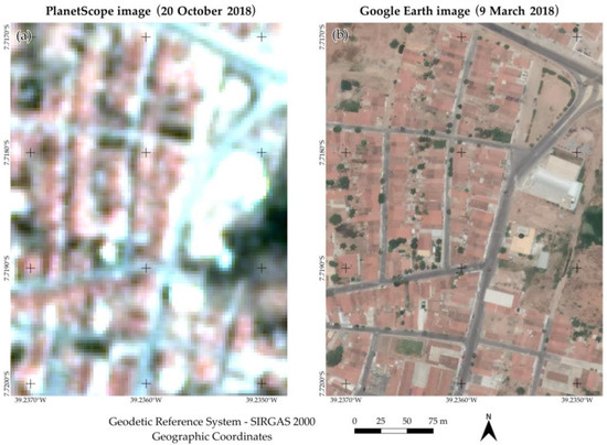 Two scenes of orbital images from the PlanetScope Instruments mission, from 2018 and 2023, were used, both acquired in October, a period of low rainfall in the region [49]. The analysis of the Caatinga’s vegetation cover is more effective during the dry season, as the vegetation is sensitive to minimal moisture, which can cause false positives during rainy periods [45,50]. The PlanetScope constellation, managed by Planet Labs, consists of over 130 satellites that offer daily global coverage [51]. The images provided by PlanetScope (PS) include four spectral bands: blue, green, red, and near-infrared (NIR), with a spatial resolution of 3 m and a radiometric resolution of 16 bits [52]. The images from PSB.SD and PS2 sensors used in this study, along with their characteristics and acquisition dates (https://www.planet.com/, accessed on 4 March 2024), are presented in Table 1.