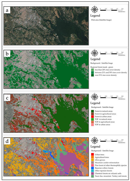 Detailed views of the tree and forest cover mapping of the Latium region, central Italy. The highlighted area represents a sample portion of the study area (a). The views represent the mapping of the regional tree and forest mask (b); the characterization of forests and Trees Outside Forest (TOF) in urban, agricultural, and natural areas (c); and the typological classification of the trees and forests of Latium (d). The complete maps are shown in the Supplementary Materials in Figures S1–S3, respectively.