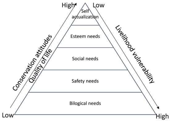 Relationships between livelihood vulnerability, subjective quality of life, and conservation attitude based on the quality of life theory derived from Maslow’s development perspective.