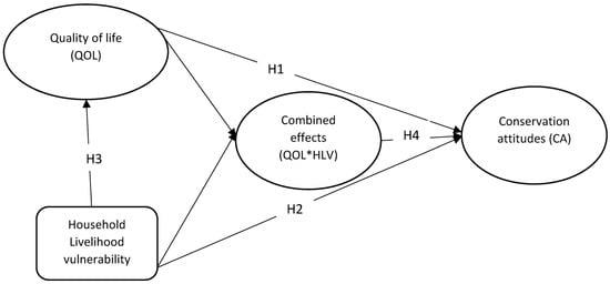 Existing research has illustrated the relevance of linkages between livelihoods and conservation [15,93], ecosystem services and human well-being [94], livelihood vulnerability and human–wildlife interaction [57], livelihood and well-being [6], and protected areas and livelihoods [95]. Therefore, we generally hypothesize that increases in livelihood vulnerability will lower the quality of life, which in turn lowers conservation attitudes (Figure 2). The following paths are specifically predicted.